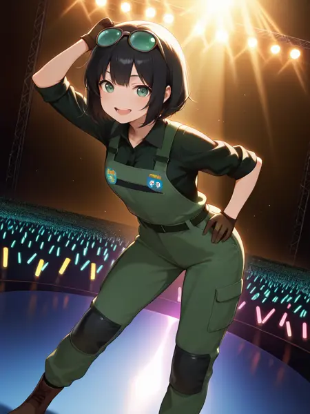 sleeves rolled up, collared shirt, belt,green overall, black collared shirt,brown gloves, badge on chest,knee pads, brown boots