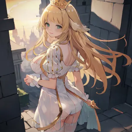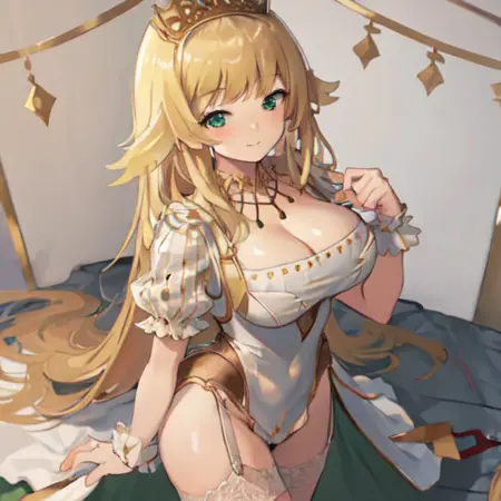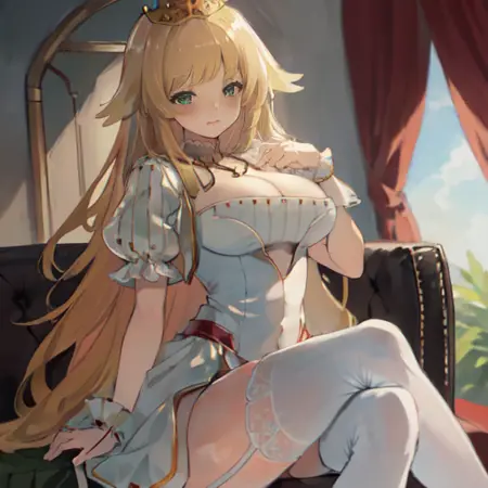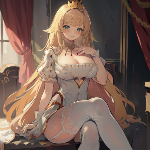 1. AG Autoluna, 1girl, solo, long hair, breasts, looking at viewer, blush, bangs, blonde hair, large breasts, thighhighs, dress, cleavage, very long hair, closed mouth, green eyes, short sleeves, thighs, white dress, white thighhighs, wrist cuffs, garter straps, standing, thighs,
