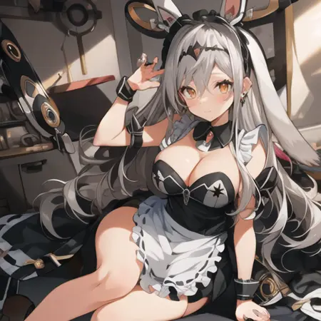 1. AG Cream, 1girl, solo, long hair, looking at viewer, blush, bangs, large breasts, dress, animal ears, cleavage, jewelry, very long hair, grey hair, earrings, frills, black footwear, rabbit ears, apron, orange eyes,