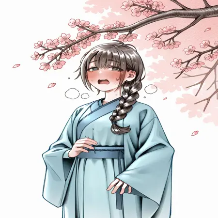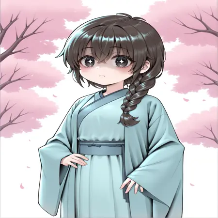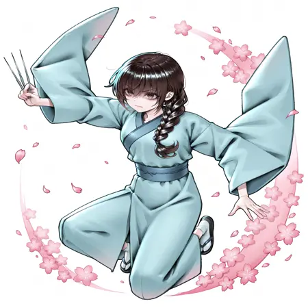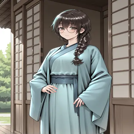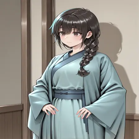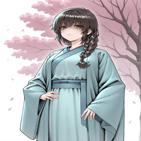 yangyusi, 1girl, solo, braid, white background, simple background, long hair, single braid, long sleeves, japanese clothes, wide sleeves, kimono, bangs, sash, hair over shoulder, brown eyes, robe