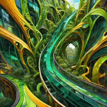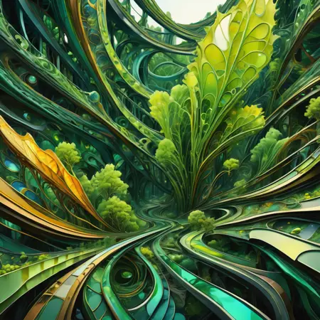 自然の芸術が中心に据えられた世界へようこそ。ここは、葉のような形の優雅さが支配する世界です。この調和のとれた広がりの中で、風景は鮮やかな緑の曲線と有機的な線で魅惑的な交響曲を繰り広げます。建築から植物に至るまで、存在するすべての要素が、葉の優雅で簡素な美しさを称え、自然の本質が息をのむほど調和して広がる、静謐で没入感あふれる環境を生み出しています。