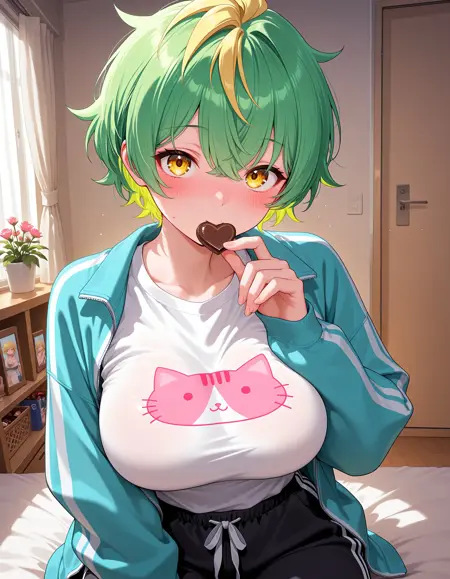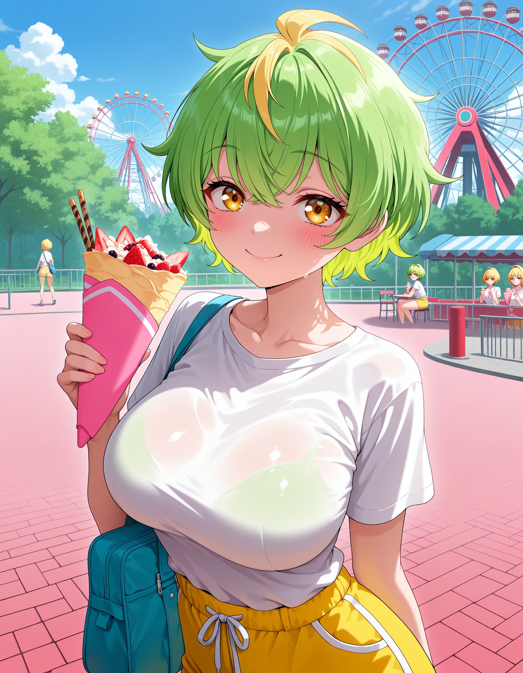short hair, green hair, blonde hair, yellow eyes, large breasts, two-tone hair, multicolored hair