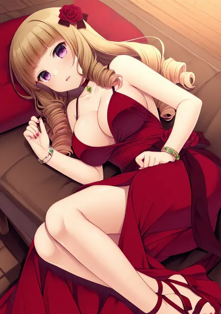 ドレス:makidrs、胸元、ブレスレット、ヘアアクセサリー、花のヘア飾り、赤いドレス、ジュエリー、チョーカー、ロングドレス、鎖骨、つま先露出シューズ、赤い薔薇、ネイルポリッシュ、ノースリーブドレス、赤いシューズ、サンダル、