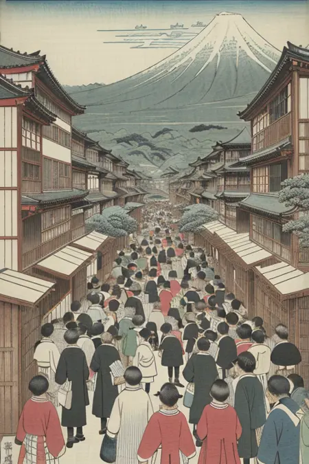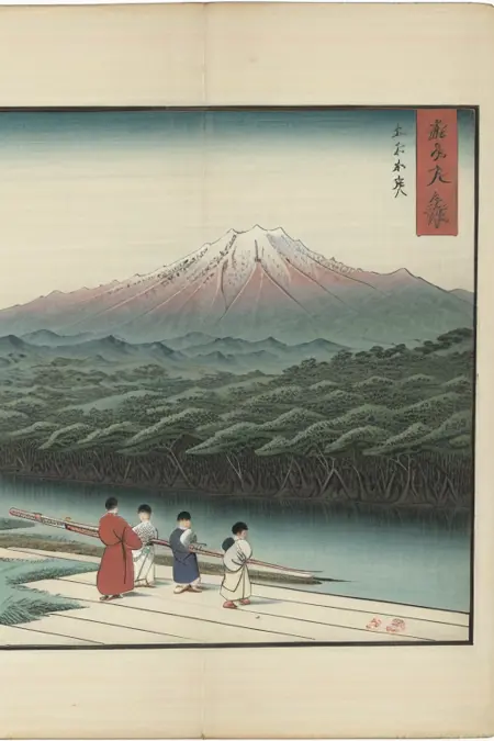 歌川広重(1797-1858)は、浮世絵の伝統に属する日本の芸術家で、この形式(「浮かぶ世界の絵」と訳される)の最後の偉大な巨匠と評されています。彼の最も有名な作品には、東海道五十三次と江戸百景があります。彼の死はこの形式の最終的な衰退を示すものでしたが、その作品は西洋のジャポニズム運動に大きな影響を与えました。たとえば、ゴッホは彼の作品の模写を描いています。