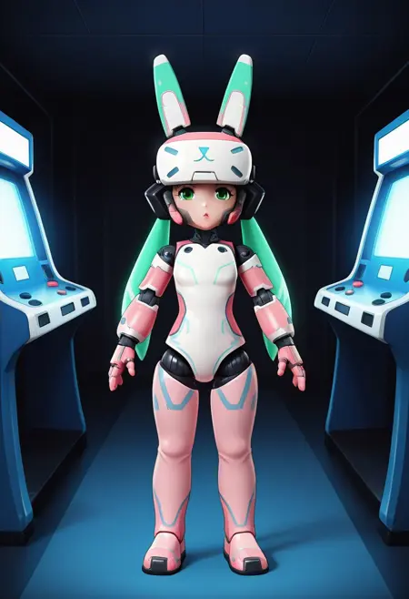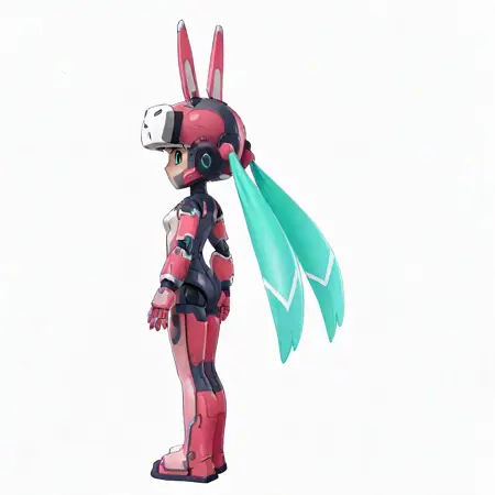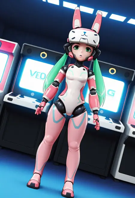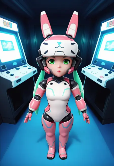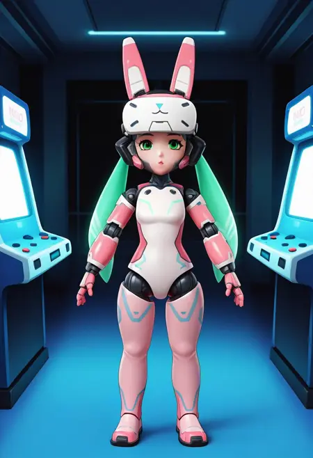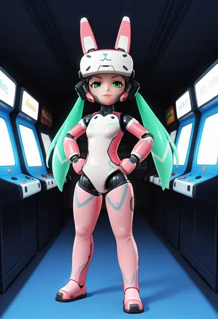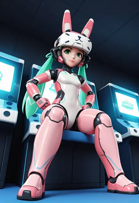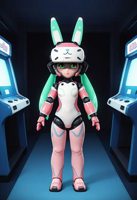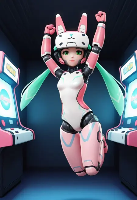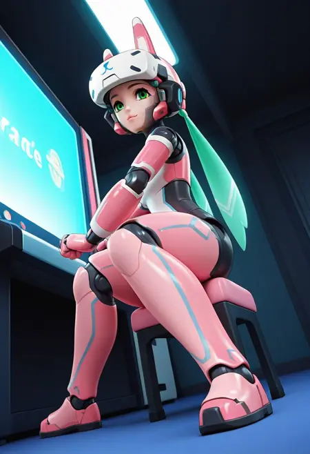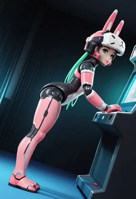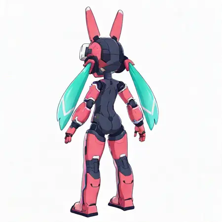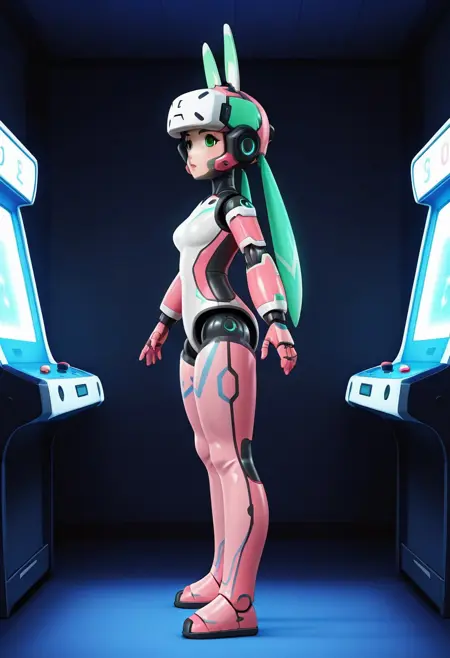 Recommended Prompts: Gindy Connor, pink, black details, mechanical joints, android, synthetic skin, robot girl, non-human texture, smooth surface, shiny details. Small body (MOE), (small waist), large legs (legs thick: 1.4), large arms).