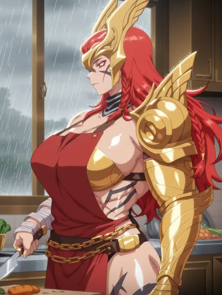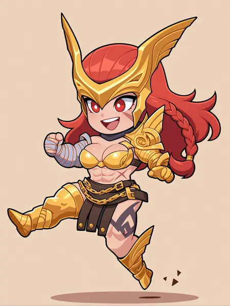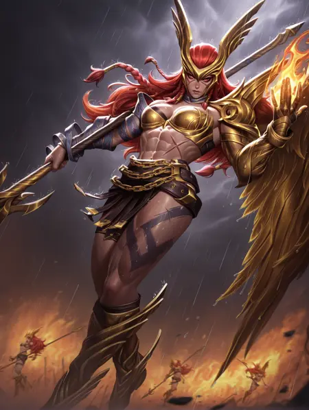 服装:金色盔甲,比基尼盔甲,腰带,臂缠,带翼头盔,肩甲,链条,单手套,单肩甲,靴子,