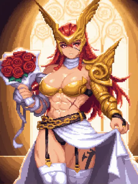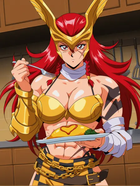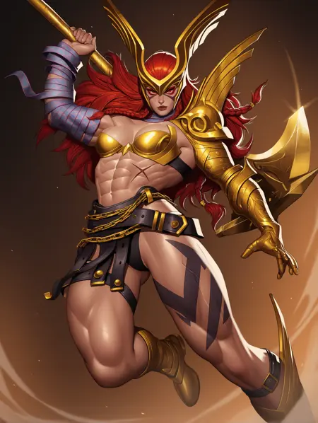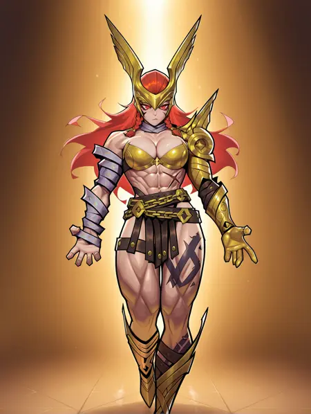 服装:金色盔甲,比基尼盔甲,腰带,臂缠,带翼头盔,肩甲,链条,单手套,单肩甲,靴子,