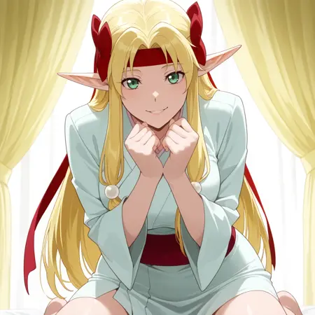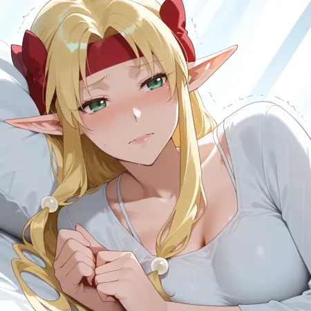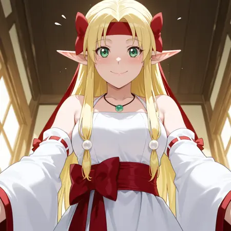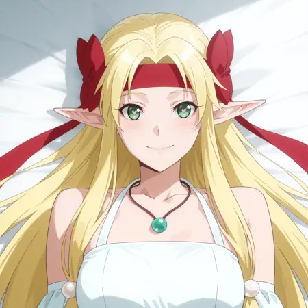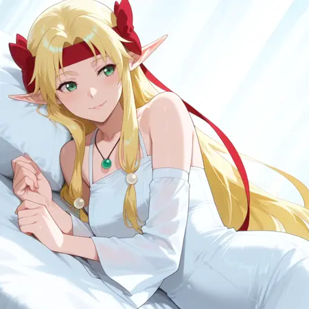 ReMonsterMail, 녹색 눈, 금발, 긴 머리, 뾰족한 귀, 빨간 헤어밴드, 엘프, 머리리본, 빨간 리본, 흰색 둥글게 생긴 머리 장식, 진주 장식,