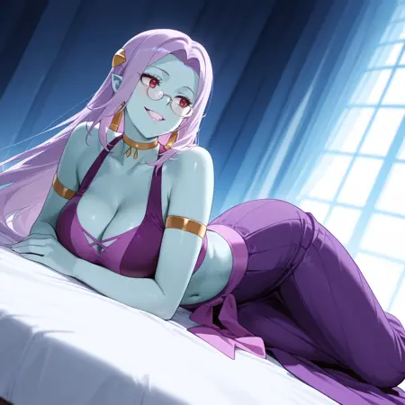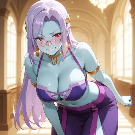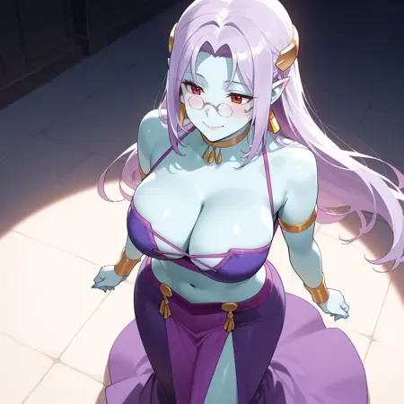 ReMonsterMi、赤い目、長い髪、尖った耳、ジュエリー、メガネ、イヤリング、髪飾り、チョーカー、紫の髪、色付きの肌、青い肌、