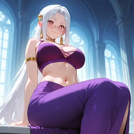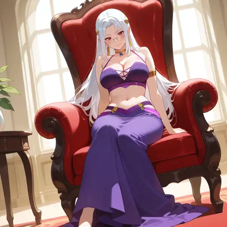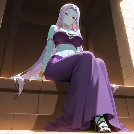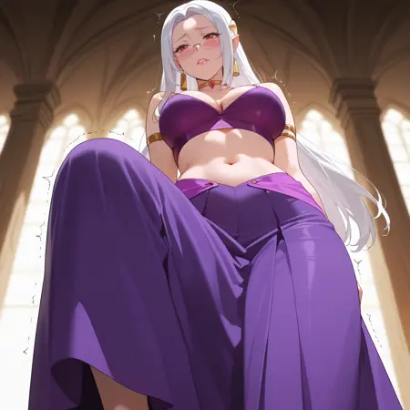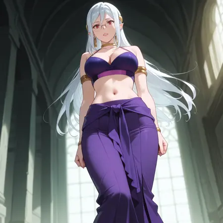 紫のショートトップス、紫のスカート、ロングスカート、胸元、お腹、腕輪、おへそ、