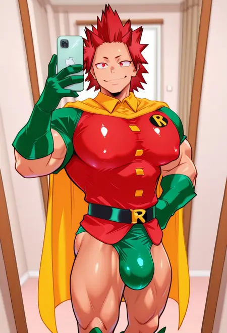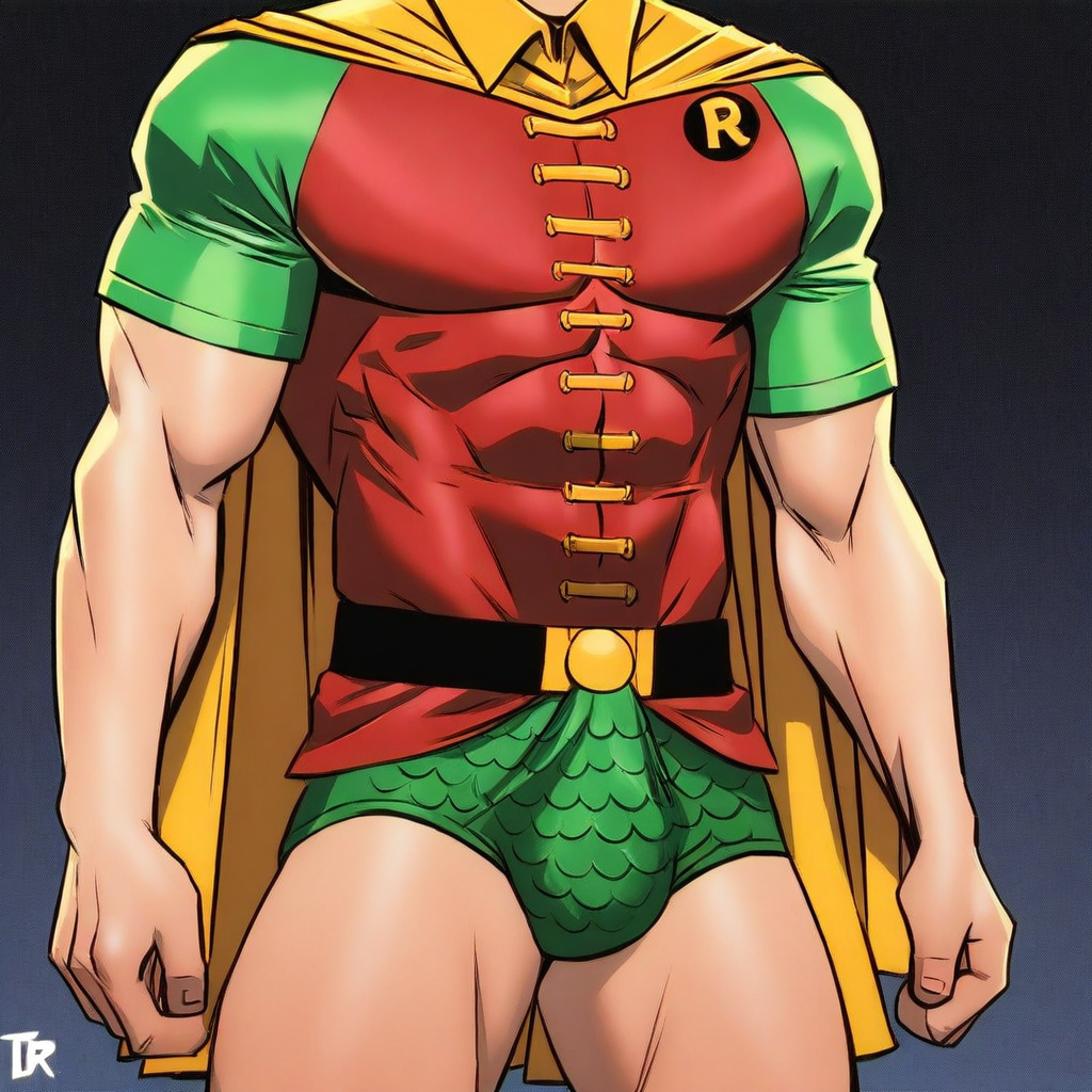 Robin costume, yellow cape, green gloves, green speedo, green footwear, red shirt with green sleeves