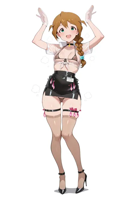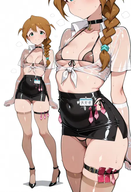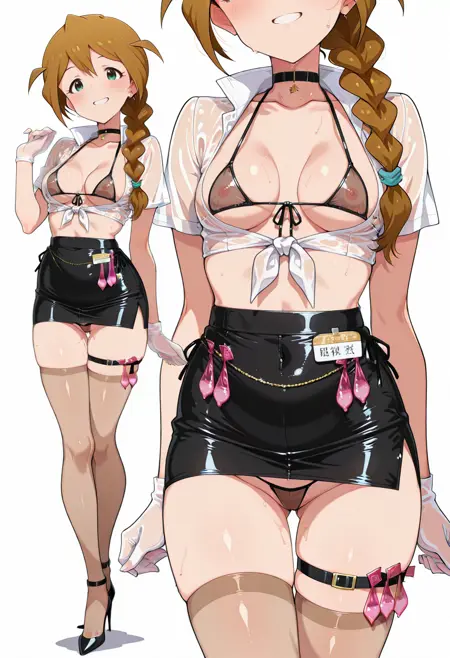 tight miniskirt,slit skirt,bare legs,black short skirt,black stiletto heels,Micro Panties,see-through micro panties,micro panties,black micro panties,front crop top,DEFTieFrontCropTop,tied front, one front tie,center closed,white tight shirt,tight shirt and nametag,collarbone,close shrit,short sleeves,shirt close,popped_collar,see-through shirt,black neck ring,see-through thighhighs,translucent micro bikini,see-through micro bikini,black micro bikini,see-through white stocking gloves,translated white stocking gloves,