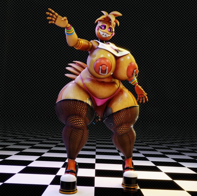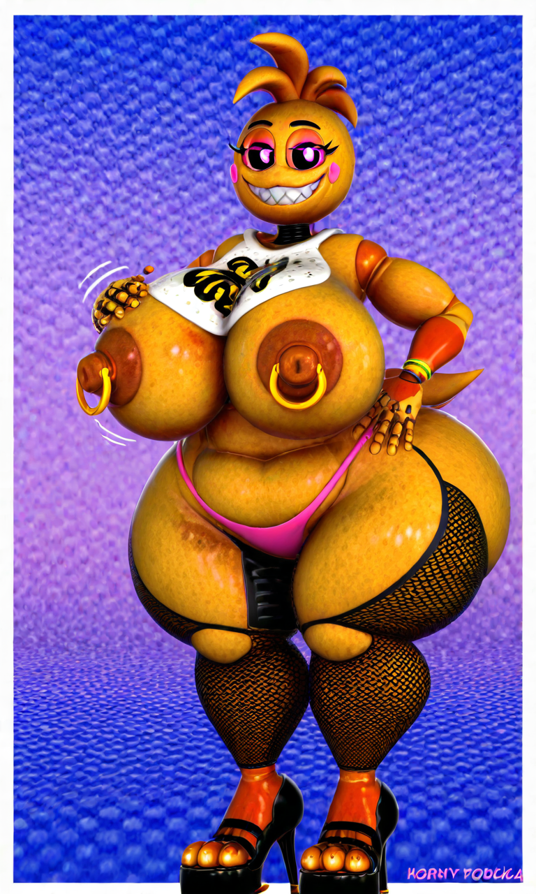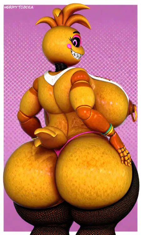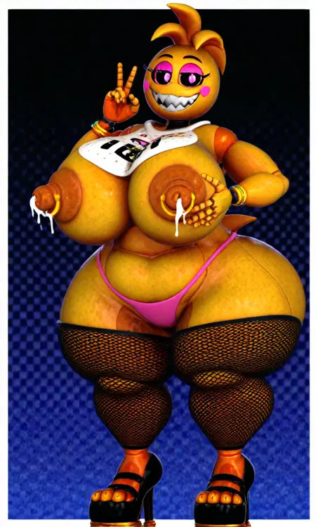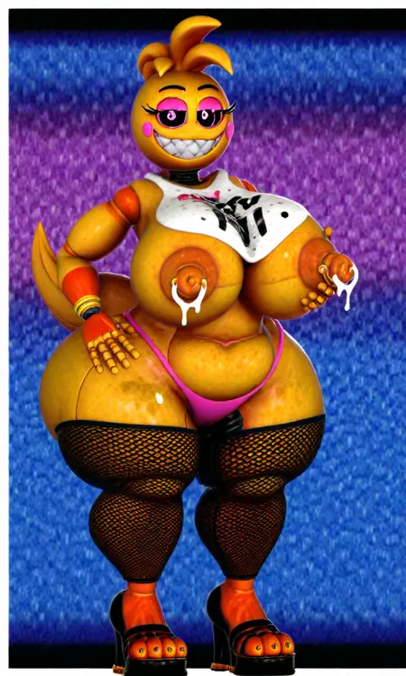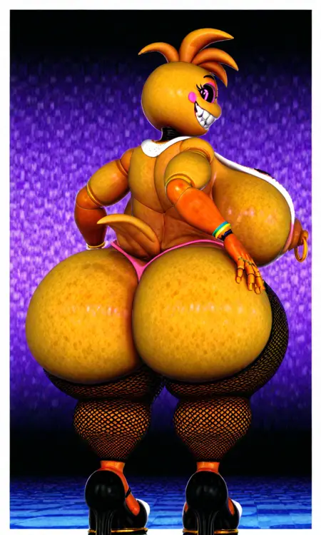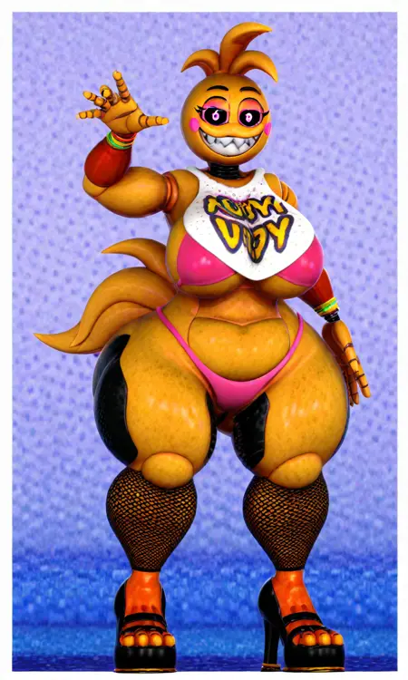 タグ: Ulti_toychica, ロボット, アニマトロニック, ジョイント, 黄色い肌, オレンジ色の足, ブラッシュステッカー, ブレスレット, 黒い白目, 紫の瞳, ピンクのアイシャドウ, 白いエプロン, 尖った歯, ピンクのトランクス, フィッシュネット, 黒いハイヒール, 乱れた髪, ピンクのブラ