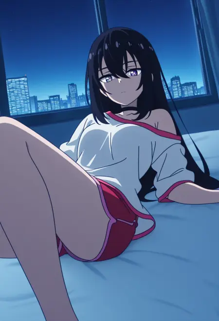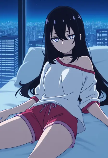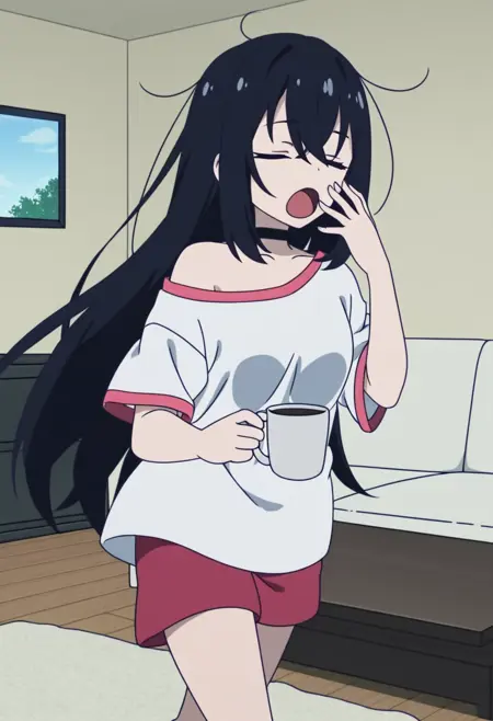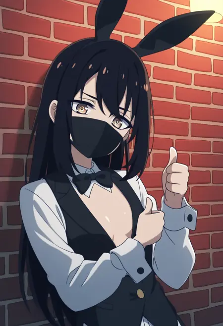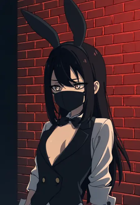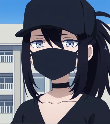 default outfit, ponytail, black face mask, black choker, black v-neck t-shirt with red text saying "Fuck", blank black baseball cap, no pants