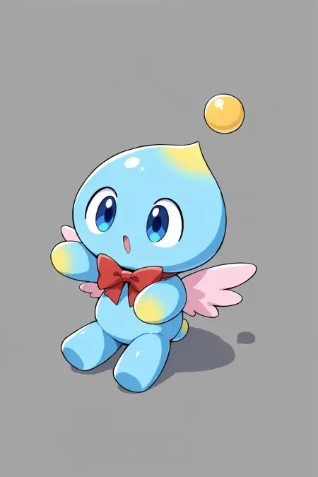 Che3eseSX, small blue body, round yellow sphere atop of head, yellow highlights on head hands and feet, large, oval-shaped blue eyes, Small pink wings, red bowtie, short, chibi,