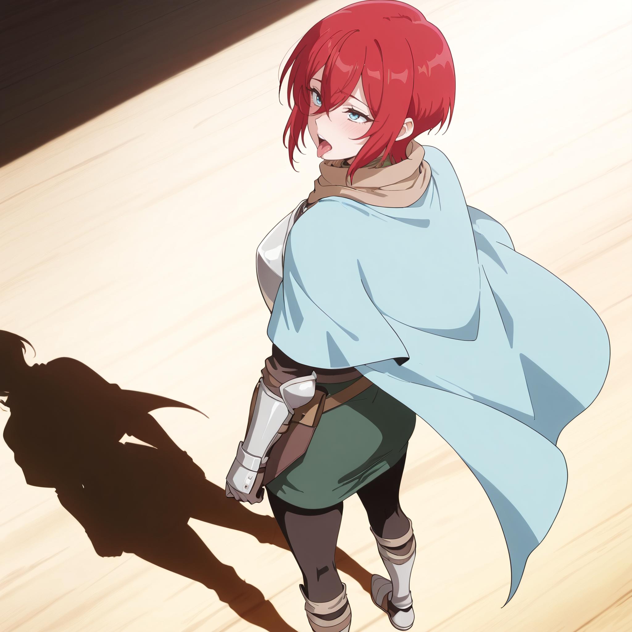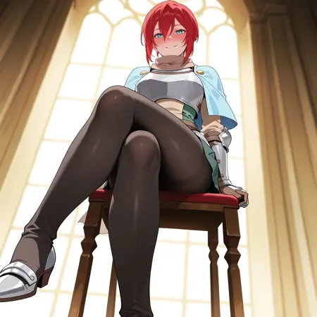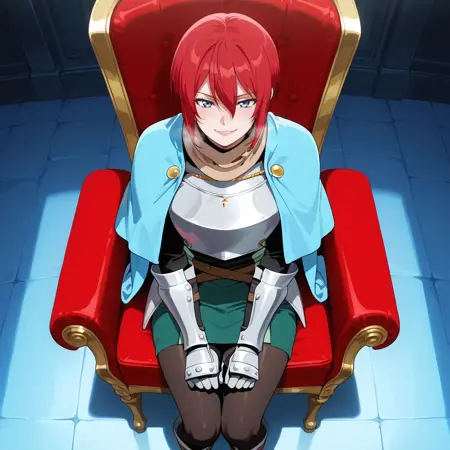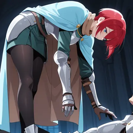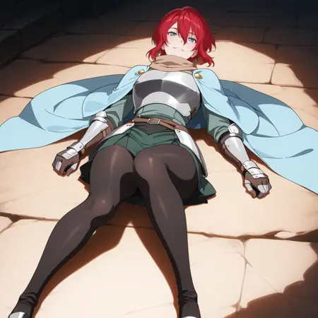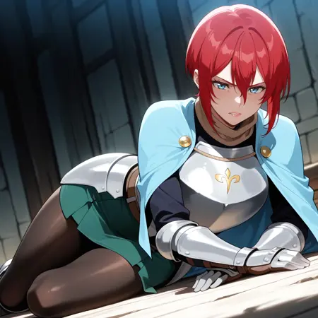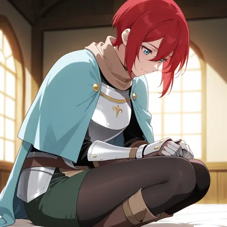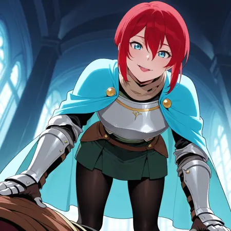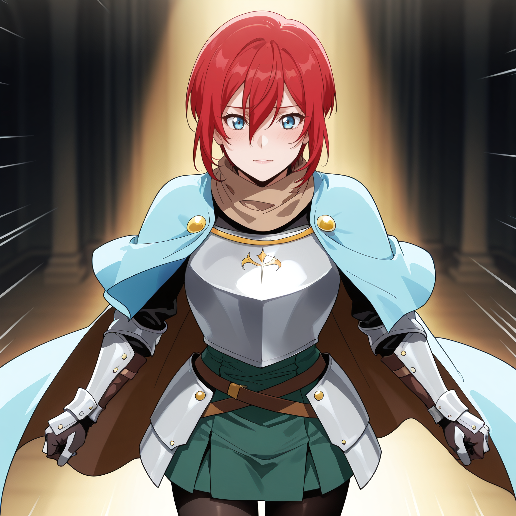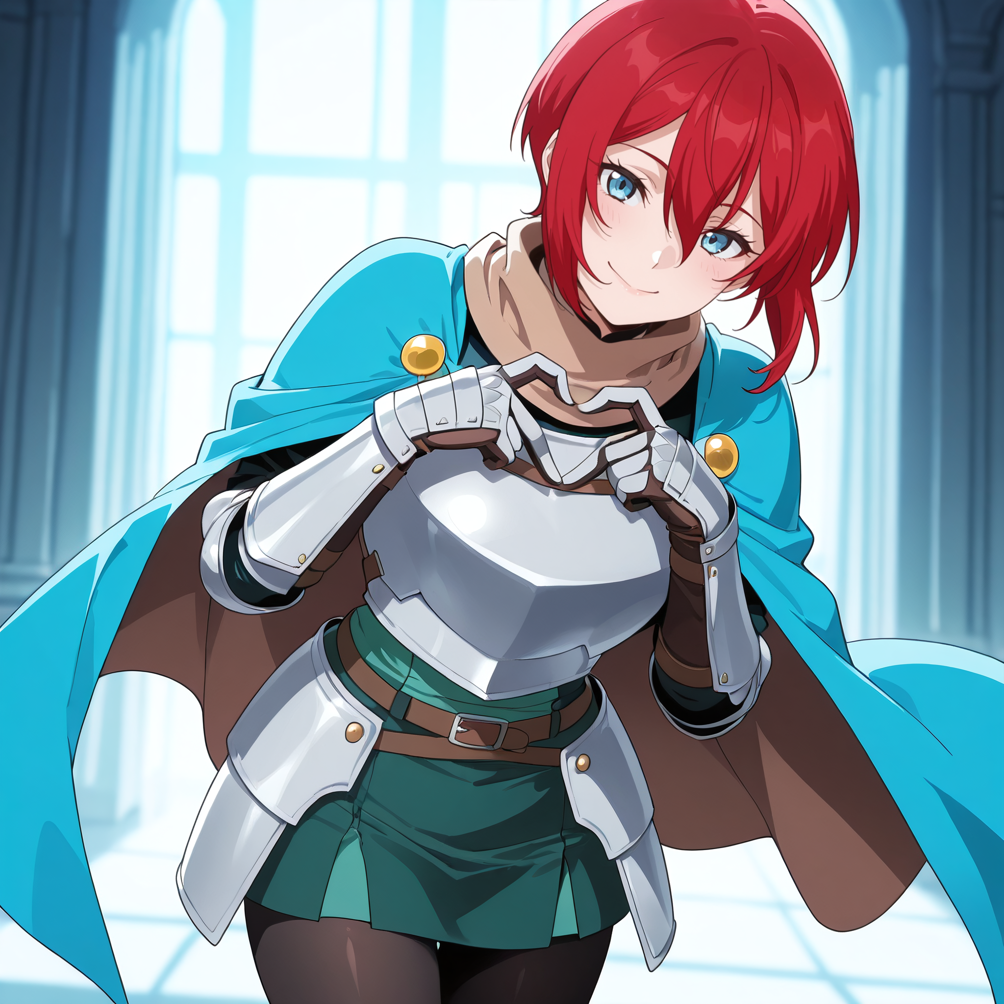 skirt, scarf, armor, breastplate, gauntlets, blue capelet, cape, gloves, black pantyhose,