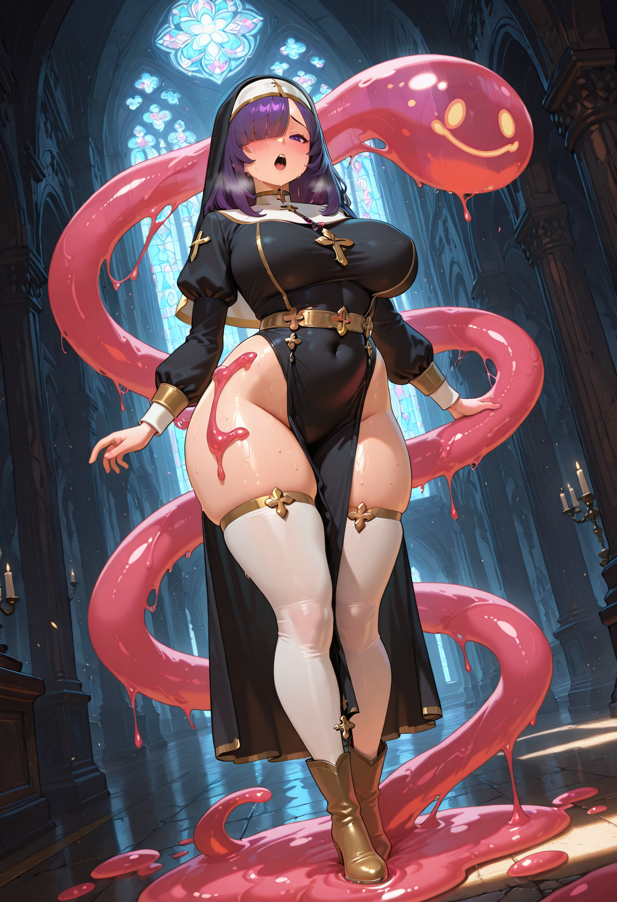 parasite-slime, slime \(substance\), slime \(blob\), slime \(creature\), slime tentacles, pink slime, translucent slime, tentacle bondage, buried legs, buried hands, sitting on slime