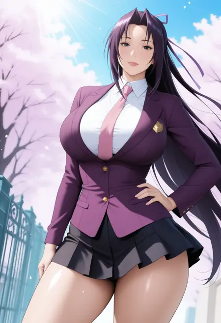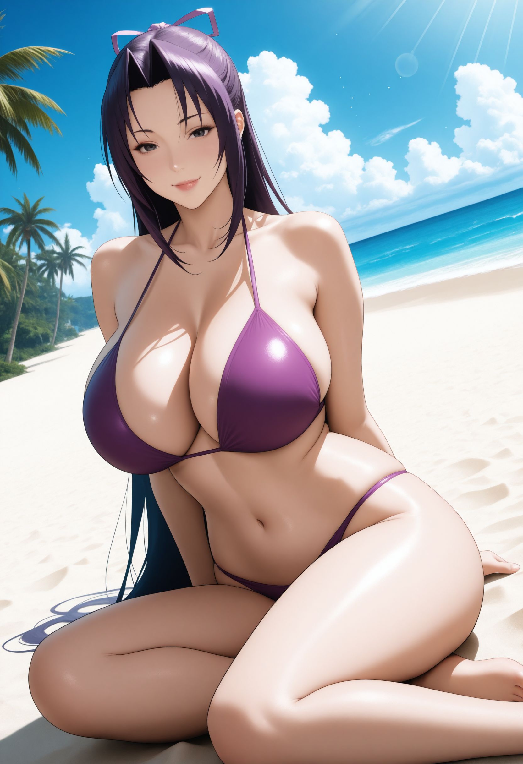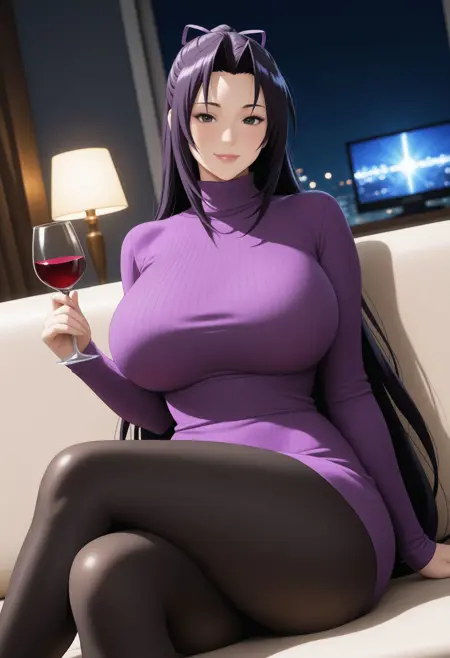 • 主提示词:1girl, solo, very long hair, dark purple hair, parted bangs, sidelocks, black eyes, huge breasts, narrow waist, wide hips, thick thighs, hair ribbon, purple ribbon, lipstick,