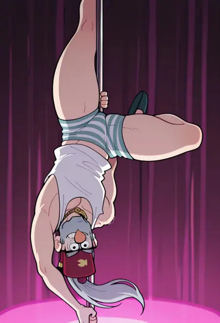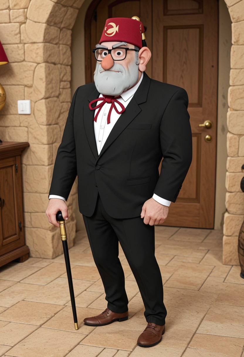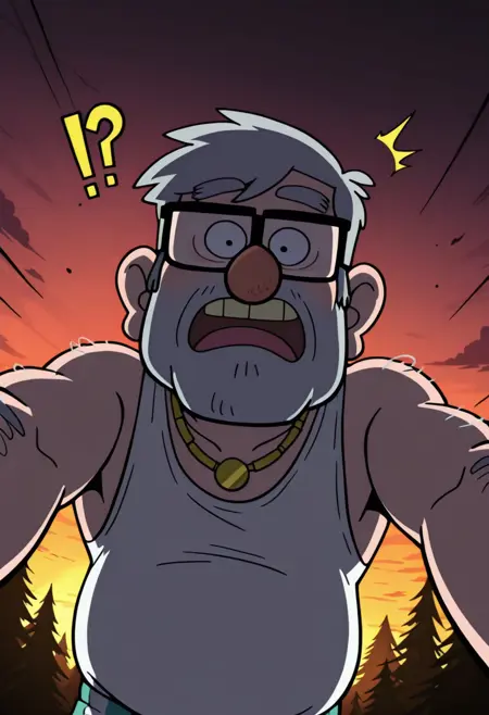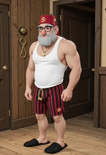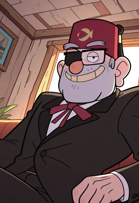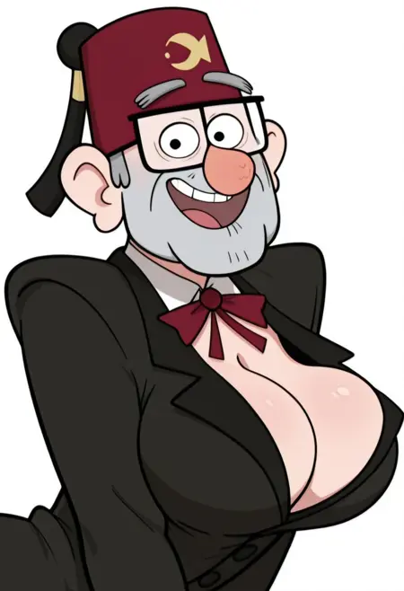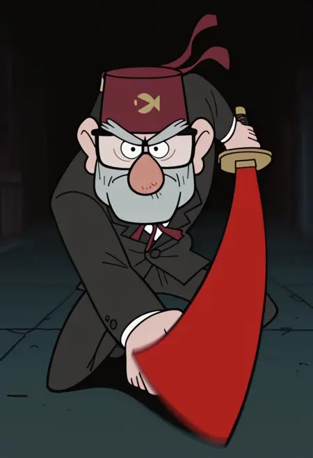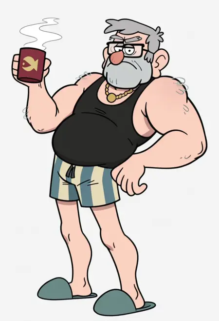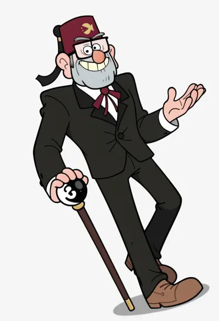 | トレーニングワード | <lora:grunkle_stan:1>コピーしました! grunkle_stan, grey hair, thick eyebrows, glasses, sideburns, round nose, stubble,コピーしました! hat, fez, red fez, logo, tassle, black tassle,コピーしました! red bowtie, black suit, brown shoes,コピーしました! gold chain, white tank top, bare shoulders, gut, striped boxers, slippers,コピーしました! |