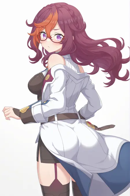 Sherry-Liver020, 1girl, solo, medium hair, long sleeves, thighhighs, hair between eyes, bare shoulders, medium breasts, purple eyes, purple hair, multicolored hair, multicolores hair, multicolore hair, two-tone hair, streaked hair, orange hair, orange bangs, bangs, belt, necktie, blue necktie, red-framed eyewear, semi-rimless eyewear, glasses, open coat, coat, jacket, white coat, lab coat, off shoulder, sleeveless, sleeveless shirt, collared shirt, white shirt, high collar pleated shirt, black bustier corset with red lacing, black skirt, miniskirt, pencil skirt, black thighhighs, black thighhighs, purple garter straps, garter straps, wrist guards, brooch, ornamental brooch, leather accessories, clothes ornaments, gold trims, open clothes,