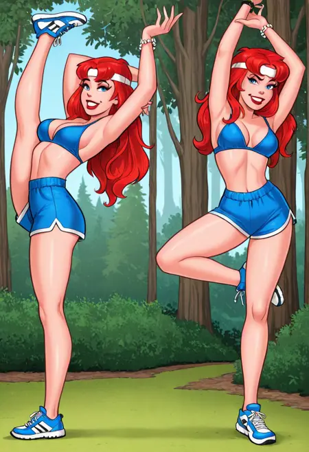 ワークアウト:白いヘアバンド、ヘアバンド、ブレスレット、ジュエリー、ビキニ、ビキニトップのみ、青いビキニ、胸元の露出、青いビキニトップ、腹部の露出、ショートパンツ、青いショートパンツ、スニーカー