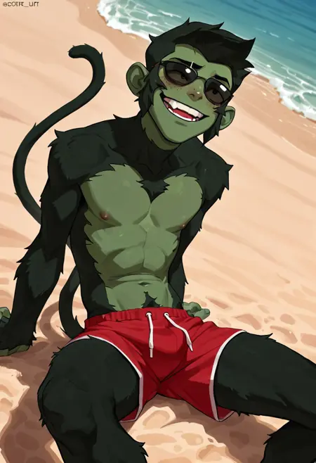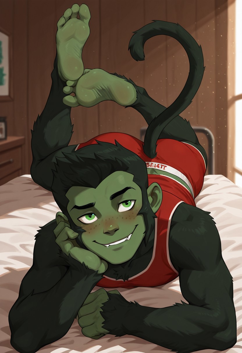 Beast Boy, Green Skin, Green Eyes, Dark Green Hair, freckles, Dark Green Fur, Body fur, fur on arms, fur on legs, monkey Tail