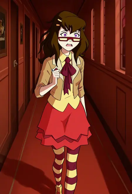 marcie_sd, brown hair, long hair, hairclip, red-framed eyewear, purple eyes, jacket, tie, skirt, striped pantyhose