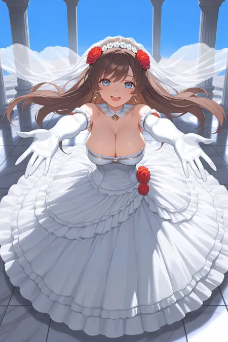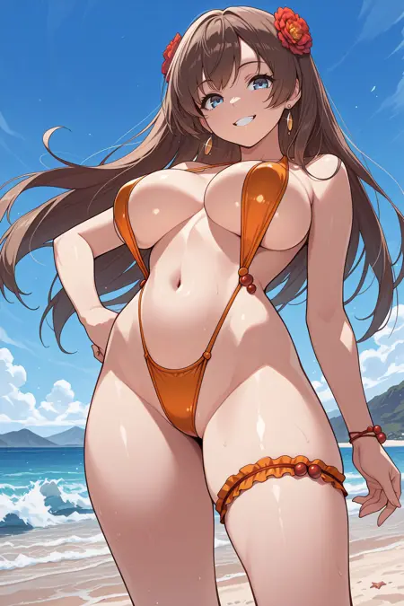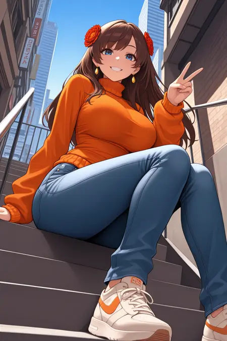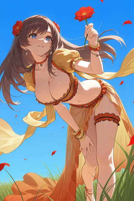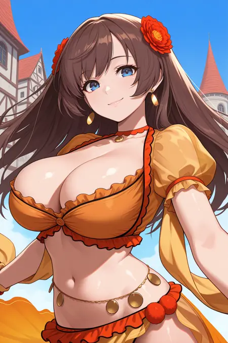 彼女の典型的な外見には、「髪の花、イヤリング、オレンジ色の首輪、オレンジ色のシャツ、ふくれた短い袖、フリル、胸元、黄色いショール、お腹、お腹の鎖、ブレスレット、透け感のあるサラング、オレンジ色のサラング、オレンジ色のウェディングブレス、サンダル」を追加してください。