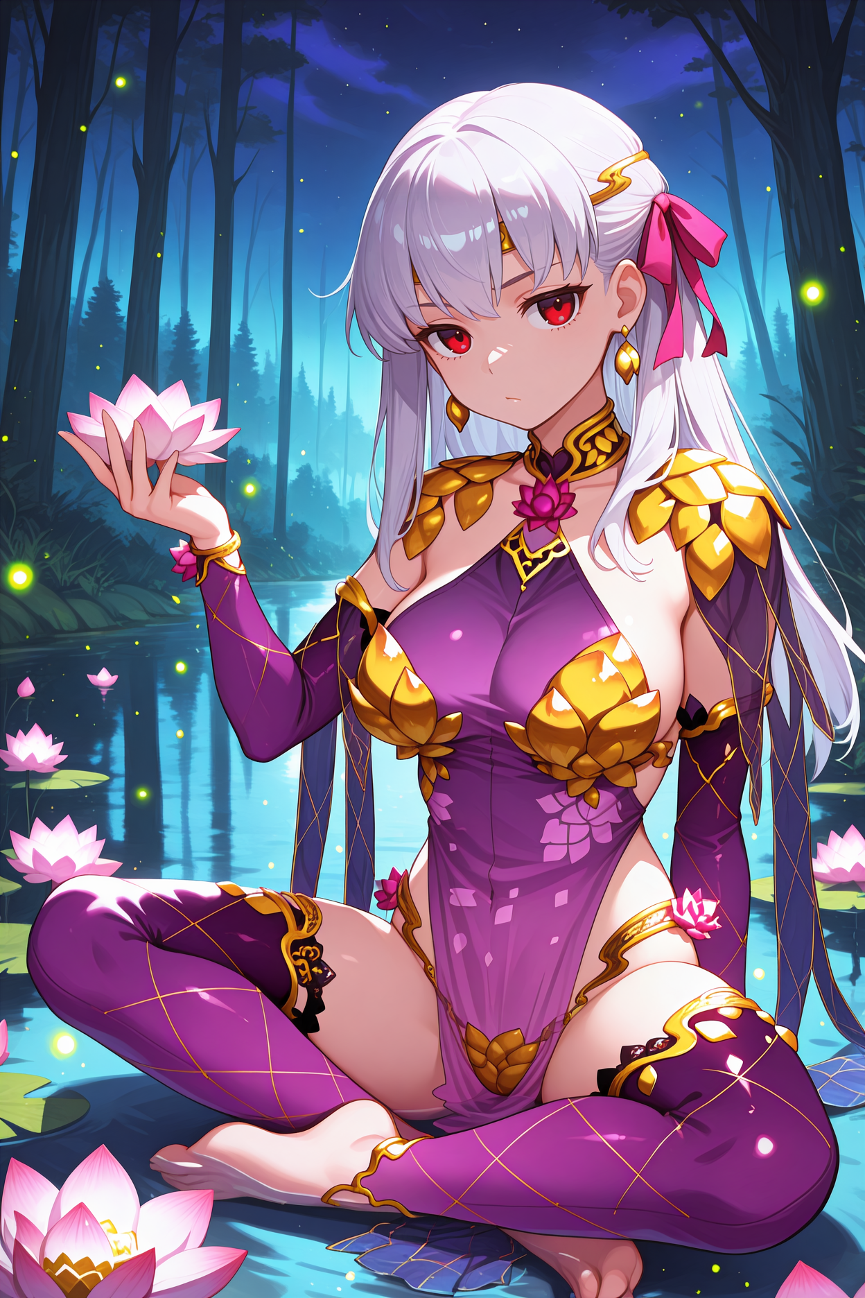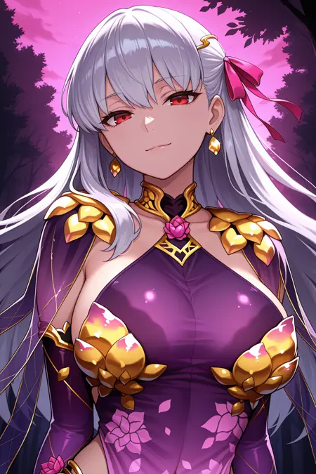 카마(2단계 각성)에는 "2akma, 긴 머리, 은색 머리, 빨간 눈, 큰 가슴, 황금 머리띠, 헤어 리본, 분홍 리본, 황금 귀걸이, 황금 목걸이, 황금 갑옷, 비키니 갑옷, 보라색 드레스, 플로럴 프린트, 골반 커튼, 반투명, 황금 팔찌, 분리된 소매, 보라색 소매, 팔찌, 허벅지 보호대, 보라색 허벅지 양말"을 추가하세요.