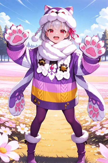 드림 포트리트 옷에는 "dmpkma, 단발, 은색 머리, 빨간 눈, 땋은 머리, 작은 가슴, 동물 코스튬, 동물 모자, 헤어 리본, 분홍 리본, 흰색 발 장갑, 털 스카프, 보라색 스카프, 흰색 스카프, 배지, 펜던트, 줄무늬 스웨터, 다색 스웨터, 스타킹, 털 테두리 부츠, 보라색 부츠"를 추가하세요.
