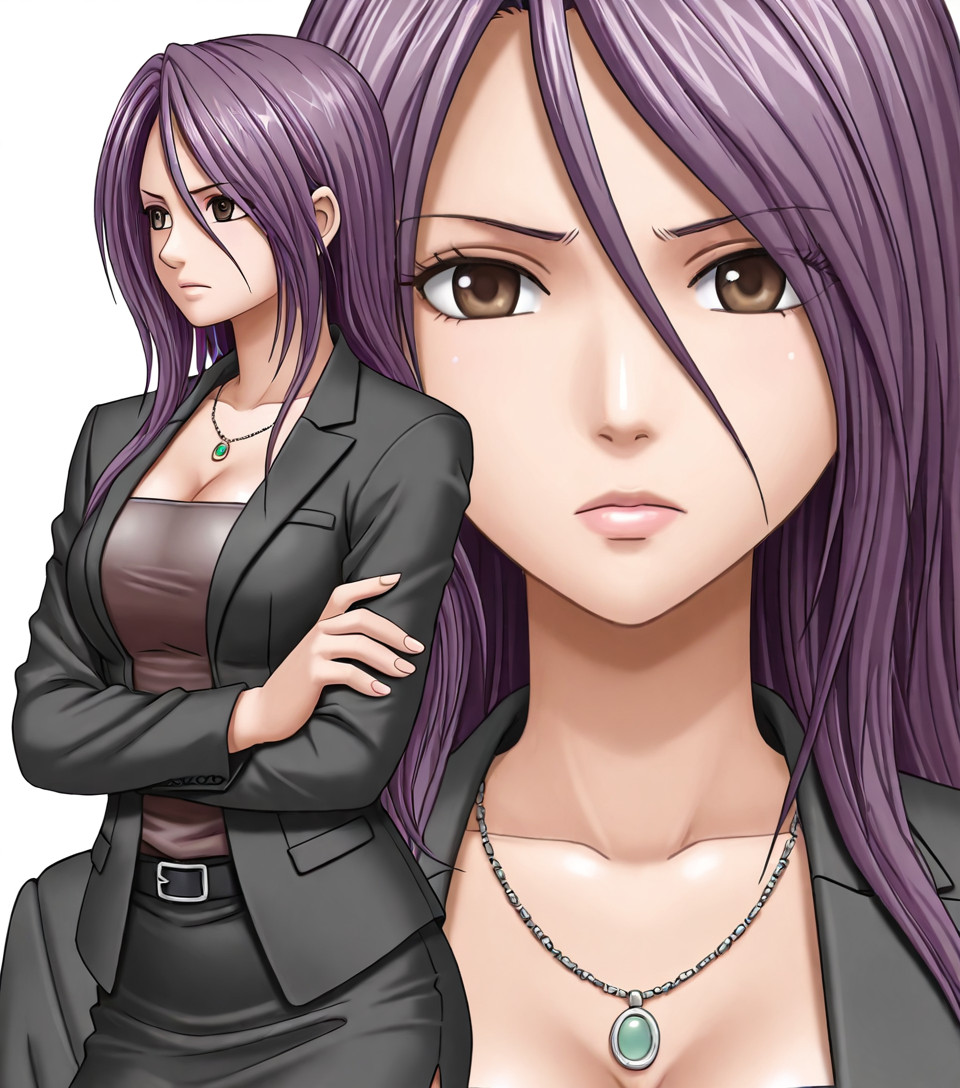"Makino Shizuki","Purple hair","Long hair", "Pencil Skirt","Brown Eyes","Skirt","High Heels","Necklace","Cleavage","Jewerly","Suit","Formal""