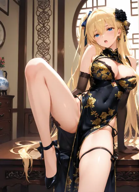 | トレーニングワード | breasts, blonde hair, hair between eyes, blue eyes, side ponytail, one side up, very long hair, hair bow, long hair, hair ornament, hair flower, hair ribbon, hair over breasts, elbow gloves, china dress, black gloves, large breasts, black dress, sleeveless, bow, floral print, rose print, rose, sleeveless dress, cleavage, cleavage cutout, clothing cutout, side-tie panties, side slit, covered navel, jewelry, earrings, pelvic curtain, (yellow Breast-clout:1.5), leg ribbon, string panties, ankle ribbon, high heels, black footwear,コピーしました! |