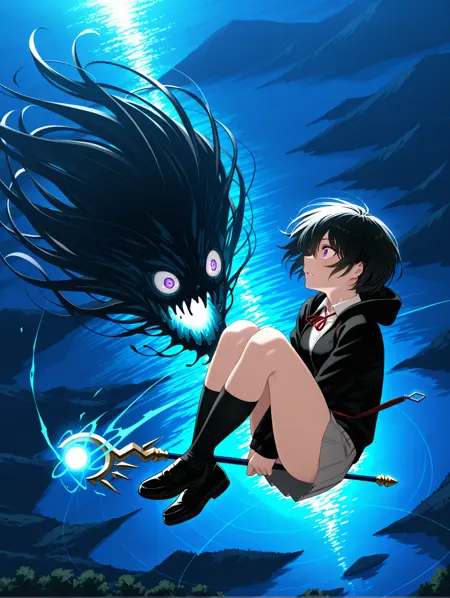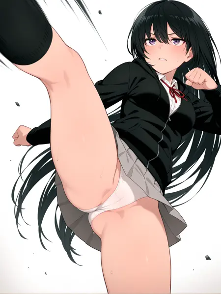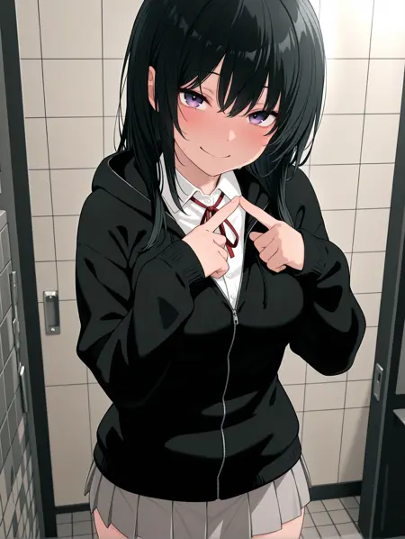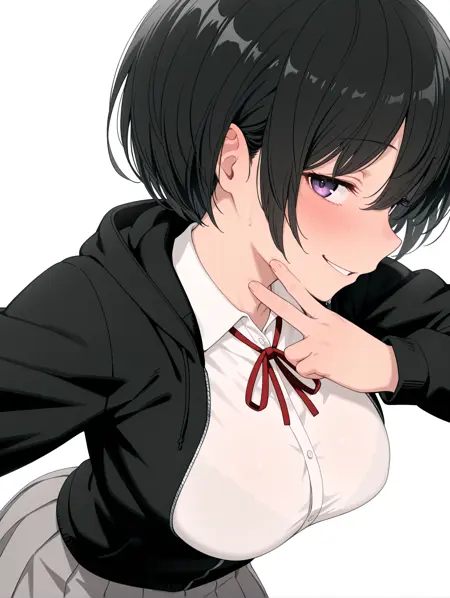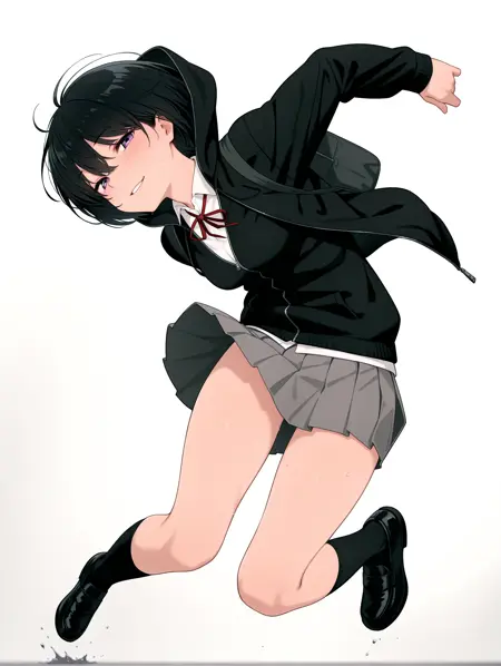 服装词(临时):黑色连帽夹克、衬衫、红色领结、灰色百褶裙、黑袜、乐福鞋