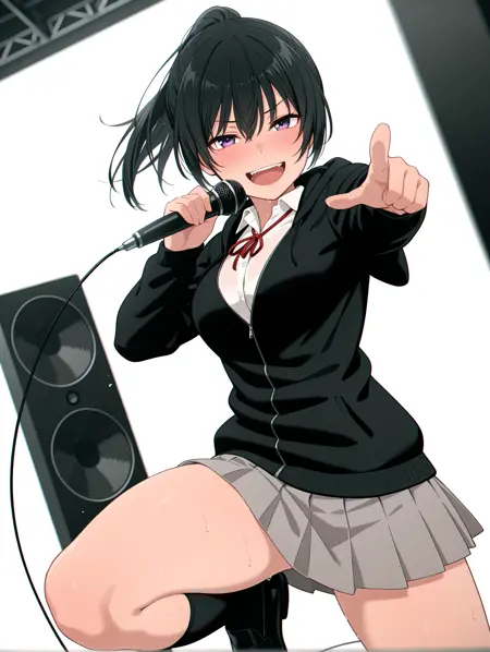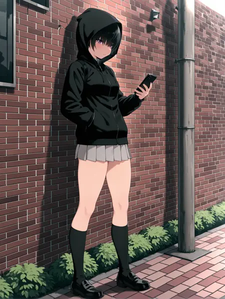 服装词(临时):黑色连帽夹克、灰色百褶裙、黑袜、乐福鞋