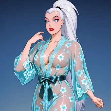 触发词:MalaDCAU, 1girl, 黑色紧身衣, 无瞳孔, 长发, 马尾, 蓝眼睛, 唇膏, 妆容, 白发, 红唇, 胸部