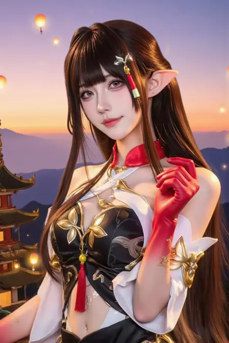 A realistic photo of a beautiful young woman with fantasy elf-like pointed ears, showcasing long brown or black hair highlighted by red accents and adorned with golden butterfly accessories or tasseled hairpins. She wears ornate Eastern-inspired attire in a palette of black, white, and brown, heavily detailed with gold trim and bold red elements like tassels and embroidered patterns. Completing the look, she has red gloves, gradient stockings from vivid red to light pink, and black shoes, potentially with golden butterfly embellishments.