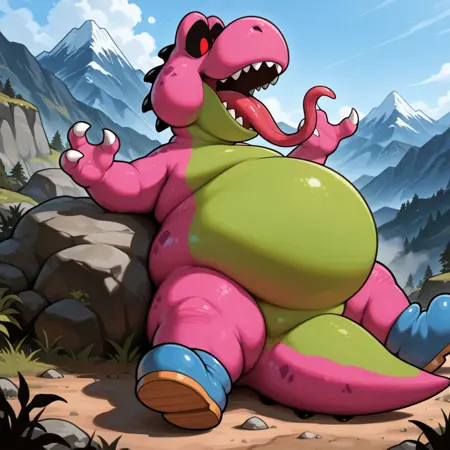 标签:恐龙、粉红色皮肤、大鼻子、红眼睛、黑色巩膜、肥胖、有爪的手、外星人、圆润的脸、男乳、蓝色鞋子、黑色甲壳