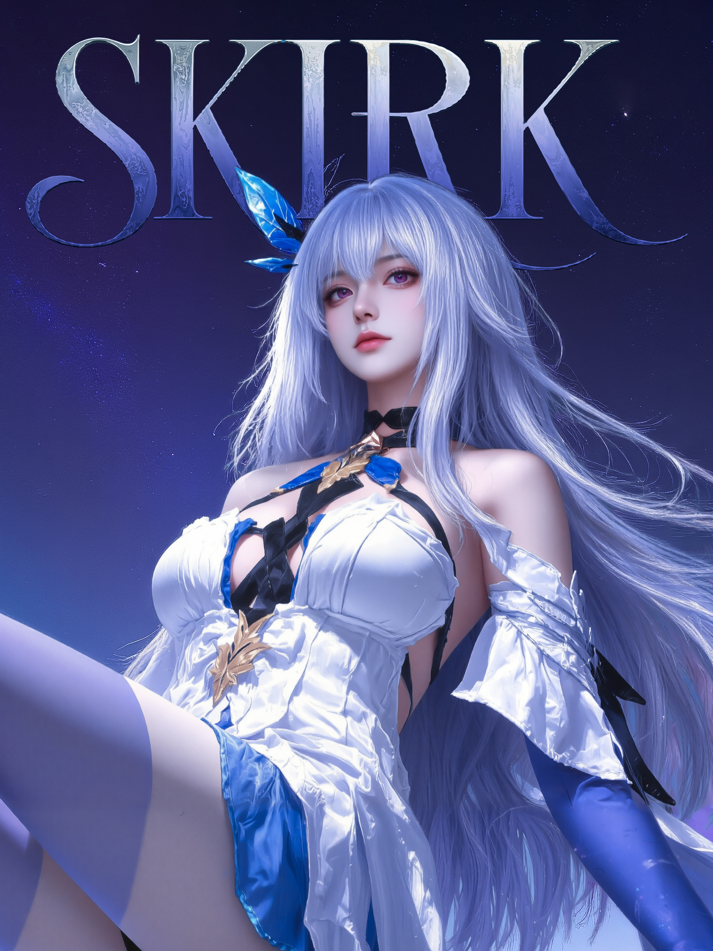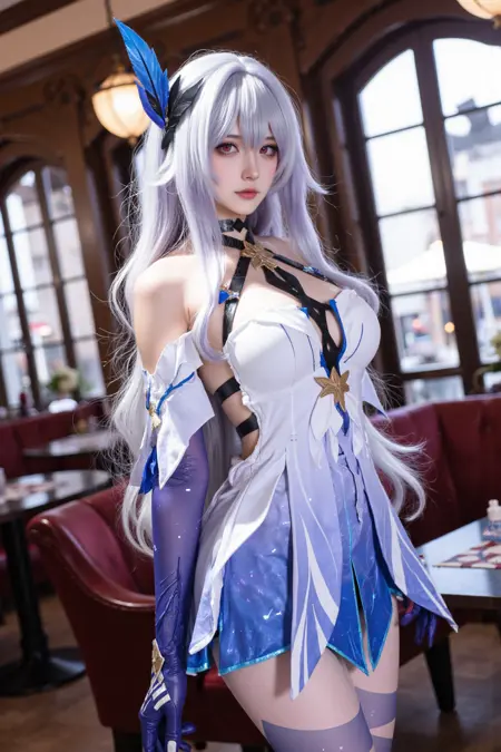 『原神』のシコケを着た、背が高く、魅力的で美しい若い女性のリアルな写真。腰まで届く波打つ銀髪には、青い羽飾りが取り付けられており、羽軸は氷のような質感で、先端は真珠のような光沢を放っている。肌は白く、鋭い眉がアクセントになっている。目は鮮やかな赤い虹彩を持ち、繊細で細長いまつげとともに、外側の角に少し赤みを帯びたセクシーなメイクが施されている。スリムな体型で、横を向いて立ち、セクシーで豊かな胸元を披露している。上着は象牙色のシルク地で、サテンのような光沢があり、胸元にはマットブラックのレザーのストラップとシルバーのバックルが交差して装着されている。右肩には、透き通った青紫色のグラデーションのガーゼが垂れ下がり、その端は霧のように儚く見える。左右非対称なスカートは、外側が硬いコバルトブルーのしわのあるシルクで、しみの部分には濃い紫の影が浮かび、内側は薄い紫のシルクのペチコートで、太ももの輪郭がほんの少しだけ透けている。前面は短く、後面は長いスワロウテイル型をしている。足元には、星模様が入った薄紫色のグラデーションの太ももまで届くソックスと、マットブラックのレザーストラップ付きのハイヒールを履いている。