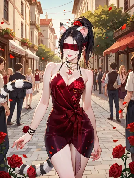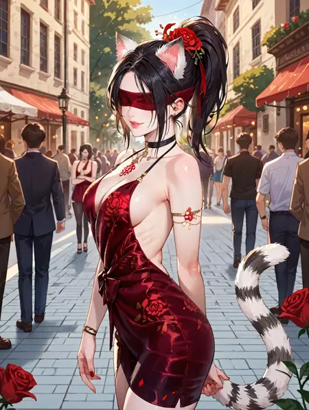 面部触发词(Facial trigger word)****: black hair,hair flower,ponytail,red_blindfold,red_lips_,