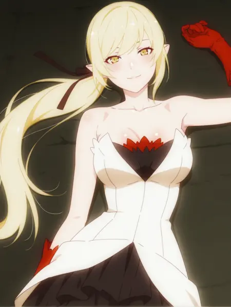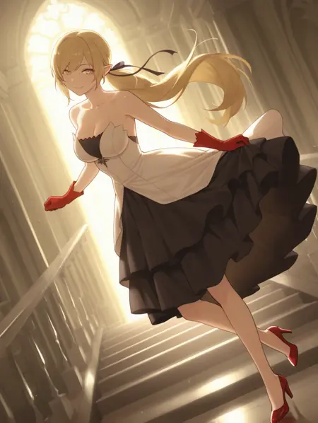 プロンプト(ドレス):kisv1、金髪、長髪、ローポニテール、前髪、黒い髪リボン、とがった耳、黄色い目、鎖骨、裸の肩、胸、赤い手袋、白いドレス、ストラップレスドレス、レイヤードドレス、黒いドレス、ハイヒール、赤い靴、