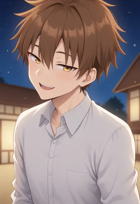 Hamaguchi , tareme, sanpaku ,Brown hair, hair between eyes , spiked hair,