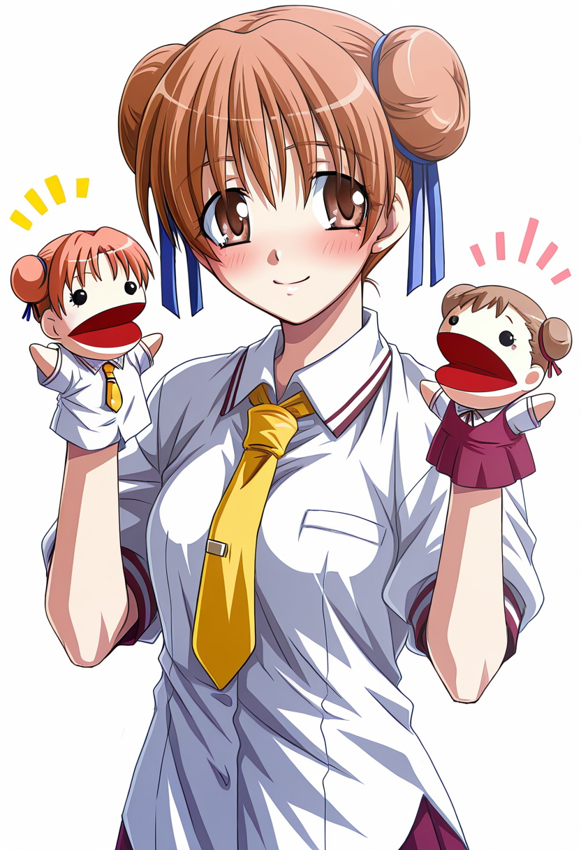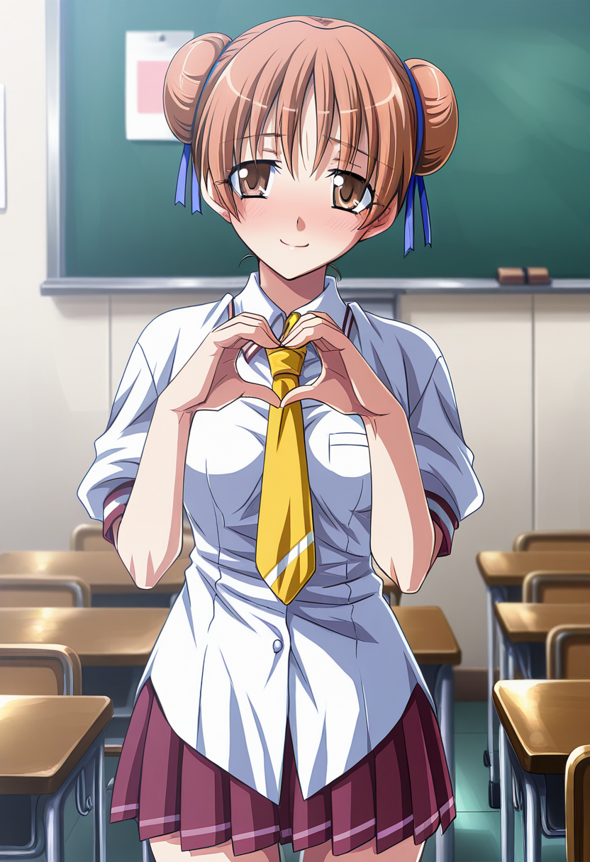 트리거 단어: m1tsu_n@deshik0, 갈색 머리, 머리 뒤로 묶은 헤어스타일, 더블 번, 갈색 눈