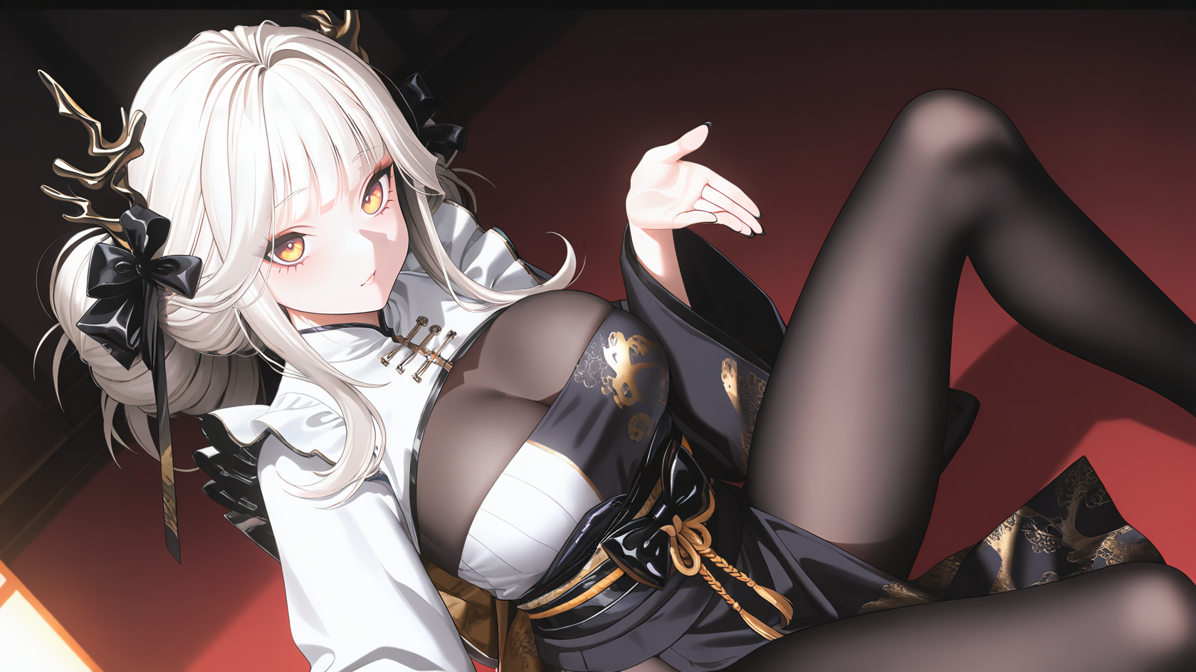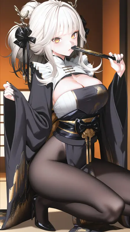 예시 프롬프트: BlancWhiteR, 1girl, long hair, breasts, bangs, medium breasts, yellow eyes, white hair, hair ornament, long sleeves, cleavage, pantyhose, horns, wide sleeves, kimono, black footwear, high heels, black pantyhose, sash, chinese clothes, obi, black nails, hand fan, holding fan,