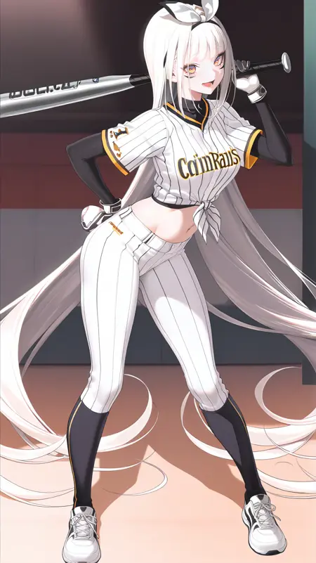 예시 프롬프트: Blanc77, 1girl, long hair, breasts, bangs, very long hair, yellow eyes, long hair, white hair, shirt, gloves, navel, white shirt, shoes, socks, midriff, striped, pants, facial mark, white footwear, sneakers, vertical stripes, sportswear, white pants, absurdly tied shirt, baseball uniform, clothes writing, baseball bat,
