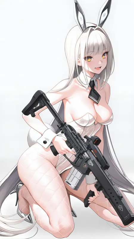 예시 프롬프트: BlancDefC, 1girl, long hair, breasts, yellow eyes, medium breasts, very long hair, white hair, pantyhose, necktie, rabbit ears, silver high heels, leotard, wrist cuffs, strapless, detached collar, fake animal ears, playboy bunny, fishnets, white pantyhose, white leotard, animal ears, cleavage, tail,