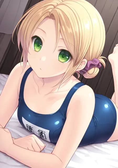 水着:tsukasaswm、素足、鎖骨、名札、青いワンピース水着、オールドスクール水着、髪の結び目、スクランチ、へそを隠す、