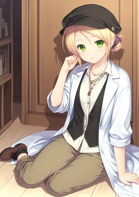 ベース:つくさ-ss、金髪、緑の目、短髪、小胸、髪飾り、
