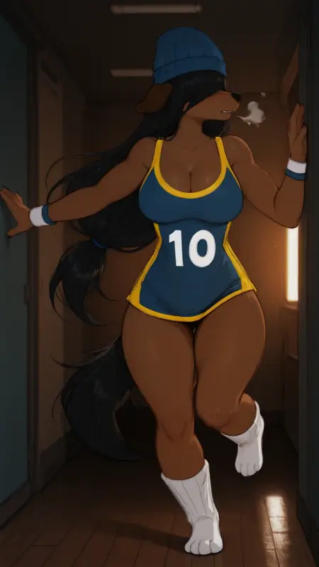 blue beanie, cleavage, white socks, wristband, basketball uniform, bottomless