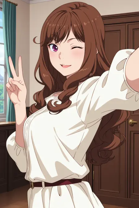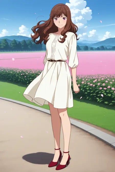 seibu kaoruko, long hair, brown hair, wavy hair, choppy bangs, purple eyes, three-quarter sleeves, white dress, belt, red shoes, strappy heels
