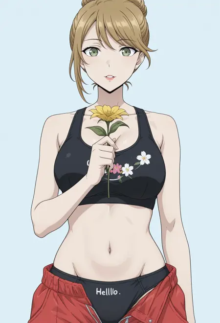 s3xy_br0wn_ga1, 1girl, solo, brown hair, hairbun, single hair bun, green eyes, lips, lipstick, collarbone, cleavage, medium breasts, navel, midriff, groin, black sports bra, print bra, red pants, baggy pants, open fly, black panties, sports panties, writing panties, hello, barefoot